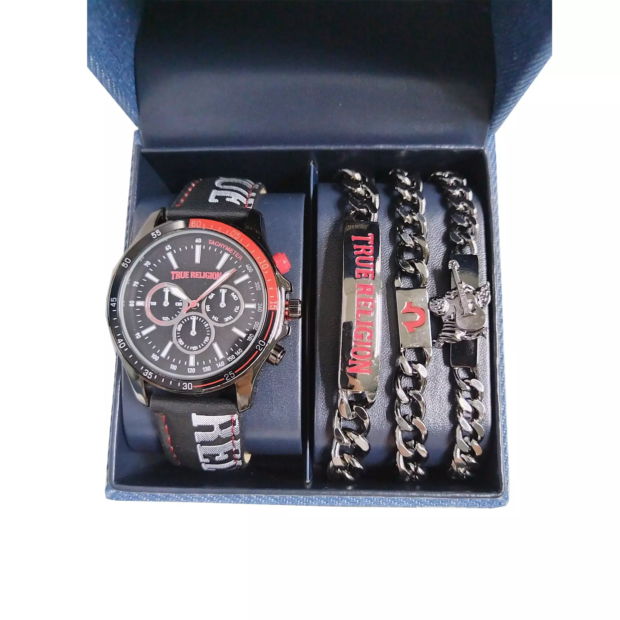 Finish your fit with the True Religion Men's Script Band Watch/Bracelet Set - Black/Red. The watch features a black band with red stitching and white True Religion script, while the stainless steel face mixes black and grey with bold red accents. Completing the four-piece set are three chain-link bracelets: one with Buddha artwork, one with the True Religion horseshoe, and one with script branding.Features