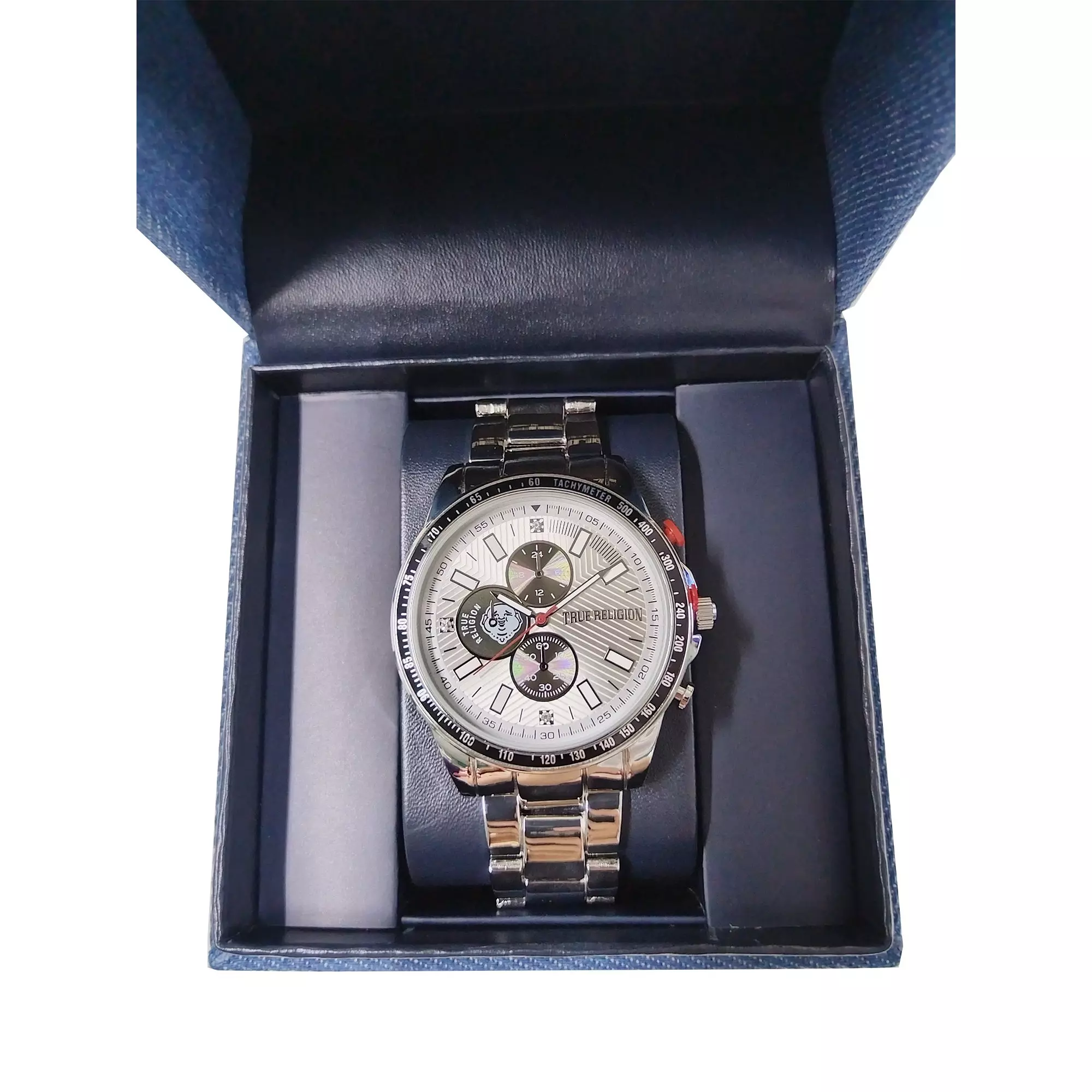 This True Religion Men's Side Silver Chrono Watch features a bold dial and reliable quartz analog movement, offering timeless style with precision performance.Features