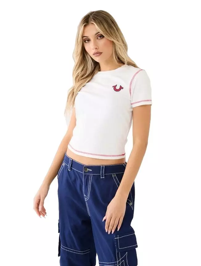 The True Religion Women's Contrast Stitch Tee - White blends soft cotton and stretch to deliver day-long comfort. It features a classic crew neck, short sleeves, and bold contrast stitching that highlights its tailored silhouette.