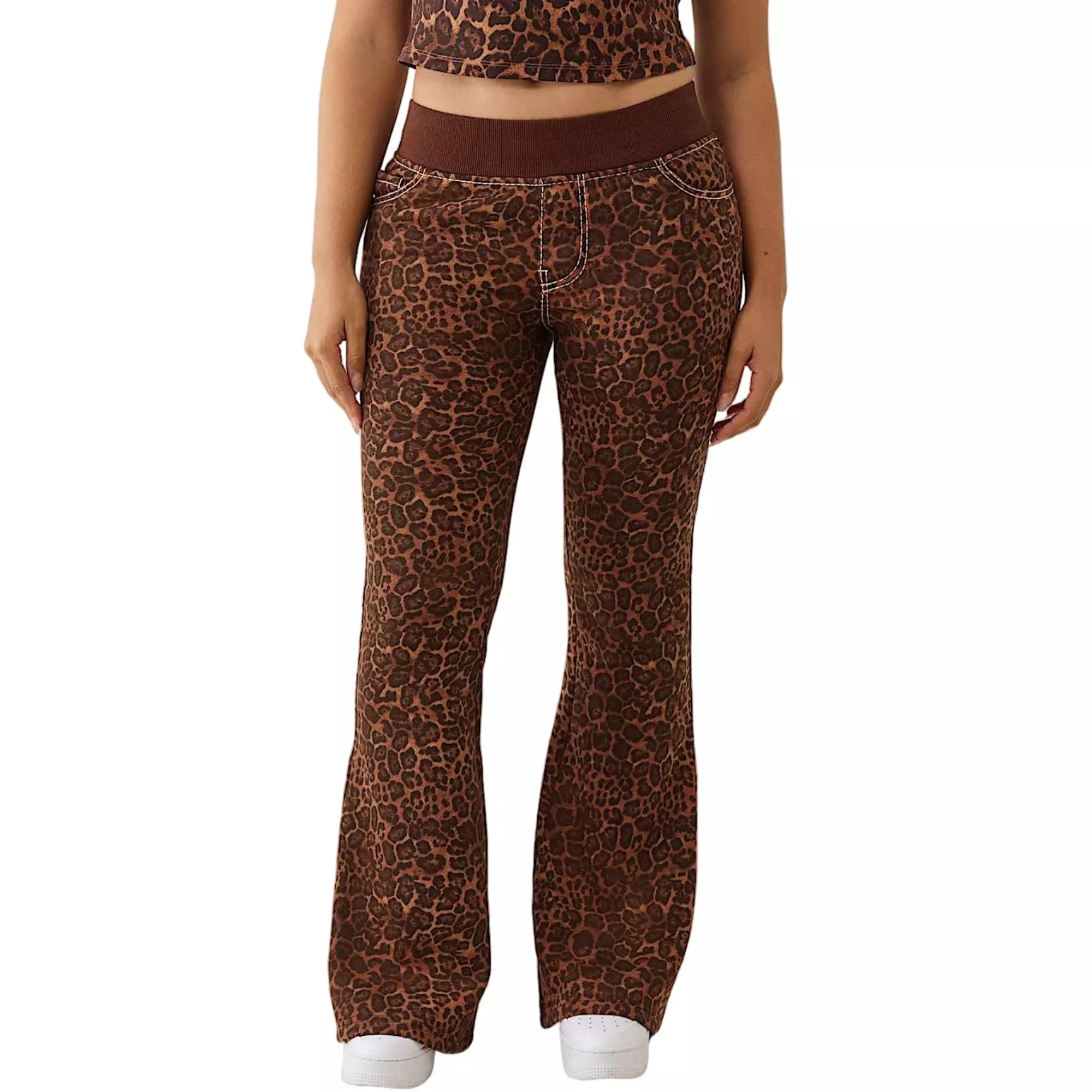 Make a statement in the True Religion Women's "Leopard Print" Mid Rise Big T Flare Pants, designed with an easy pull-on waist and a flattering flared leg. Faux front pockets keep the look sleek, while signature Big T contrast stitching elevates the finish.