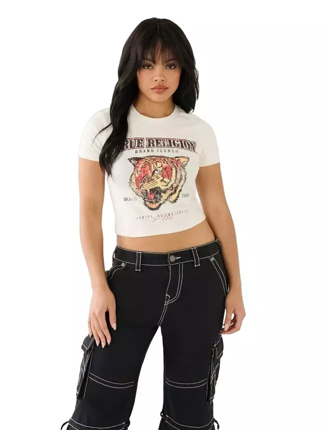 Experience the soft feel and bold look of the True Religion Women’s Tiger Graphic Baby Tee - White. This T-shirt features a relaxed baby tee fit, crew neck, and short sleeves designed to move with you.