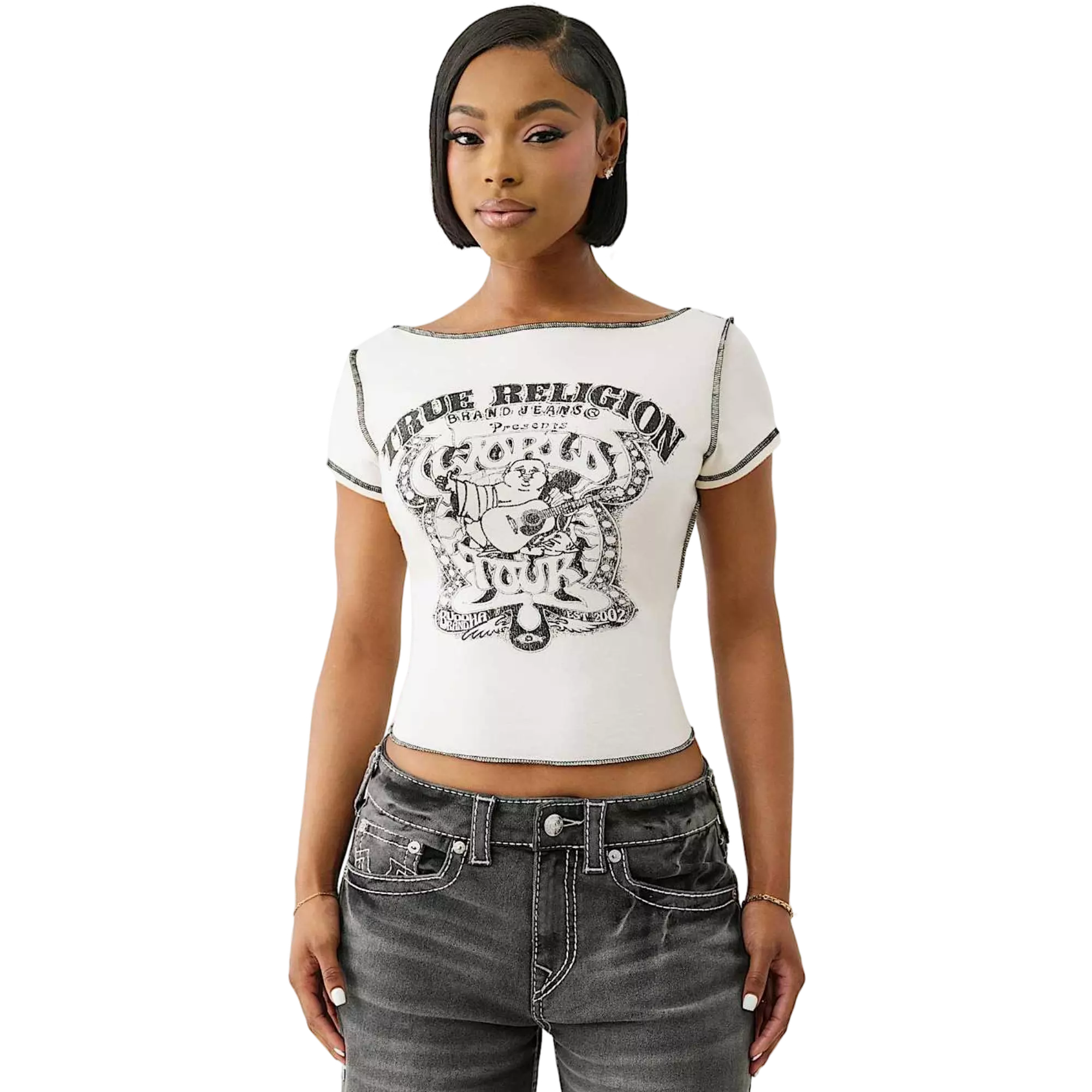 The True Religion Women's Vintage Slash Tee blends a relaxed silhouette with distinct character. Designed with a boat neckline and short sleeves, it frames the collarbone with an effortless drape. Contrast flatlock stitching reinforces each seam while adding subtle textural appeal. A faded Buddha graphic across the chest enhances the lived-in aesthetic, giving the piece a versatile vintage vibe that pairs well with casual wardrobes.