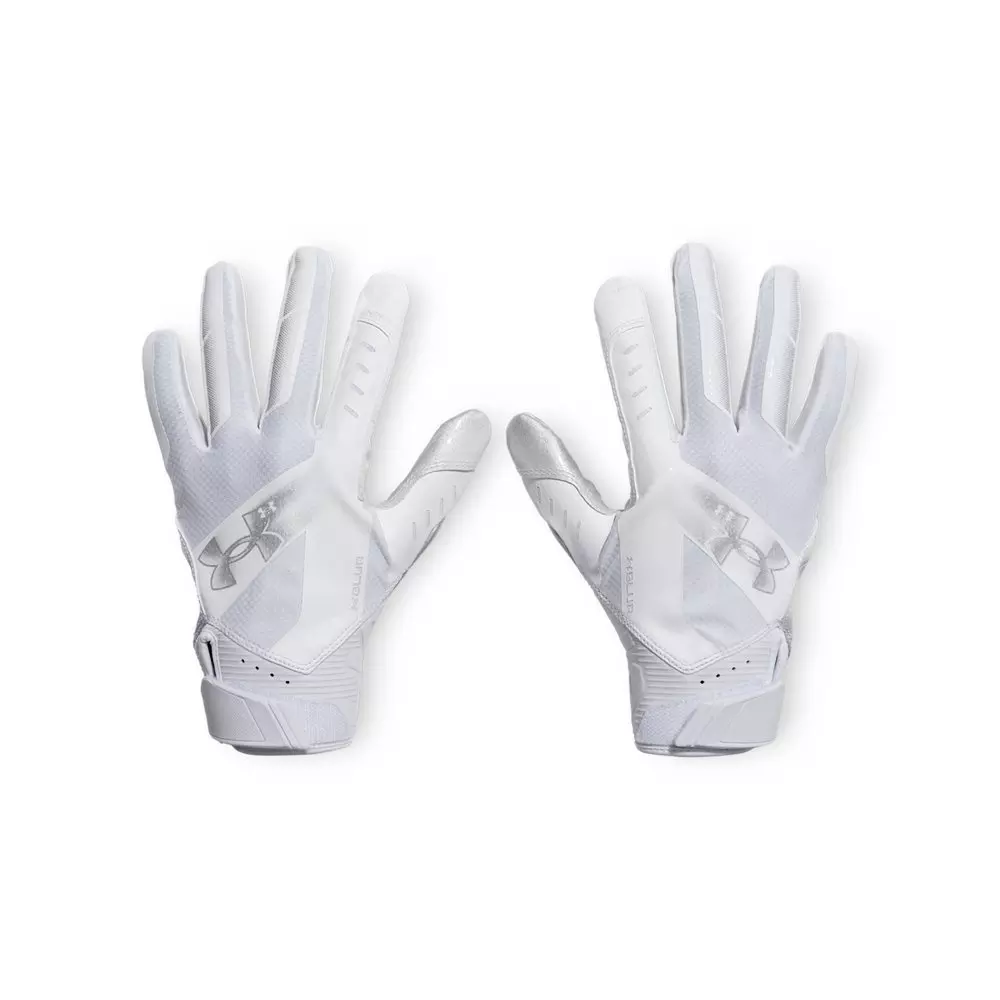The Under Armour Adult Blur Football Receiver Gloves - White/Silver combine silicone palm print and lightweight stretch fabric. This design enhances grip and mobility during every catch. The palm print uses high-tack silicone to secure the ball without added bulk.