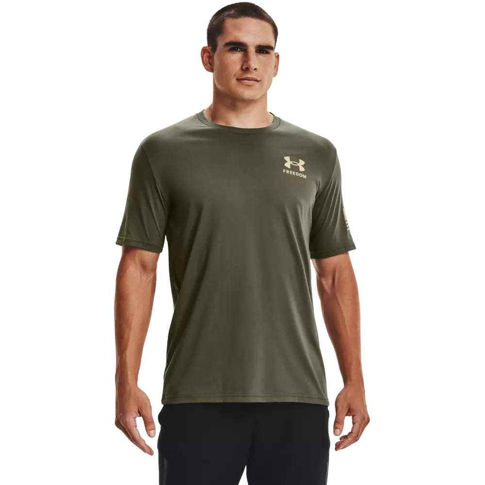 The Under Armour Men's Freedom Flag Tee-Green delivers everyday comfort with a lightweight, soft, quick-drying feel. Built for easy wear, it moves with you and wicks moisture to help keep you comfortable from warmups to weekends.
