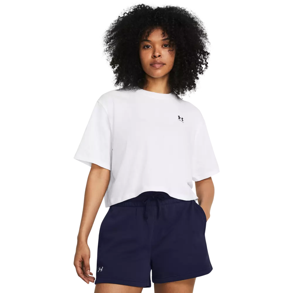 The Under Armour Women's Boxy Crop Tee combines a modern cut with eye-catching graphics that stand out in any wardrobe. Its relaxed silhouette and cropped hem deliver an effortless style statement.