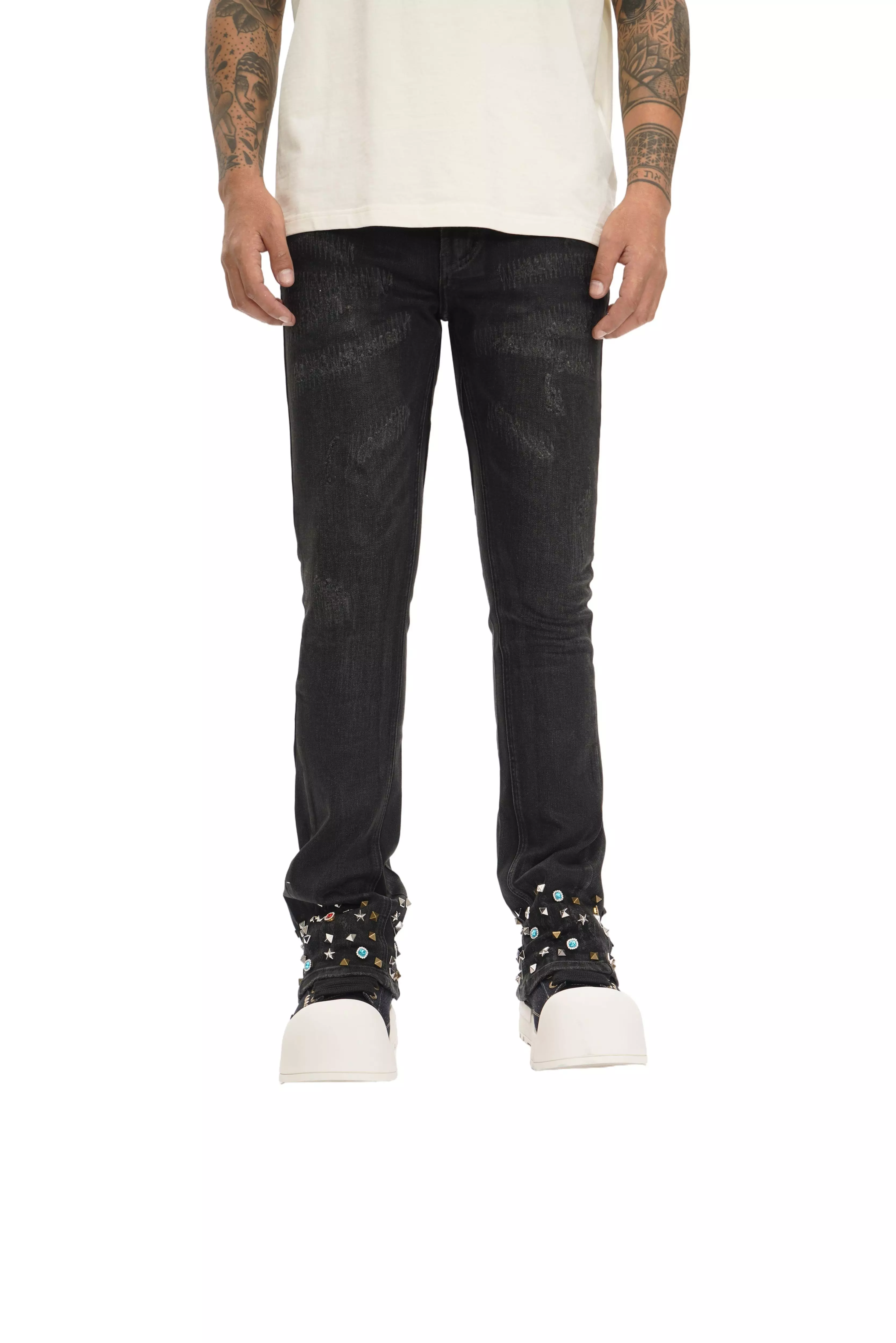 The Valabasas Men's Ion Stacked Denim Jeans - Grey Washed Wax is a bold fusion of utility and high-fashion streetwear. Designed with multiple pockets and a dark grey wax finished, these jeans provide a rugged yet refined aesthetic. The stacked flare silhouette enhances the elongated look, making them a standout piece for any contemporary wardrobeFeatures