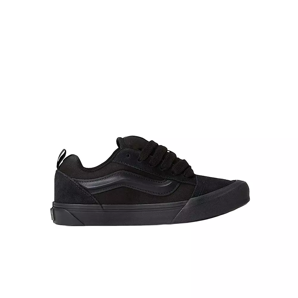 The Vans Knu Skool "Black/Black" Grade School Boys' Shoe updates a 90s favorite with bold details that stand out. A puffed tongue, 3D-molded Sidestripe, and oversized laces create a chunky, street-ready look while nodding to classic skate heritage.