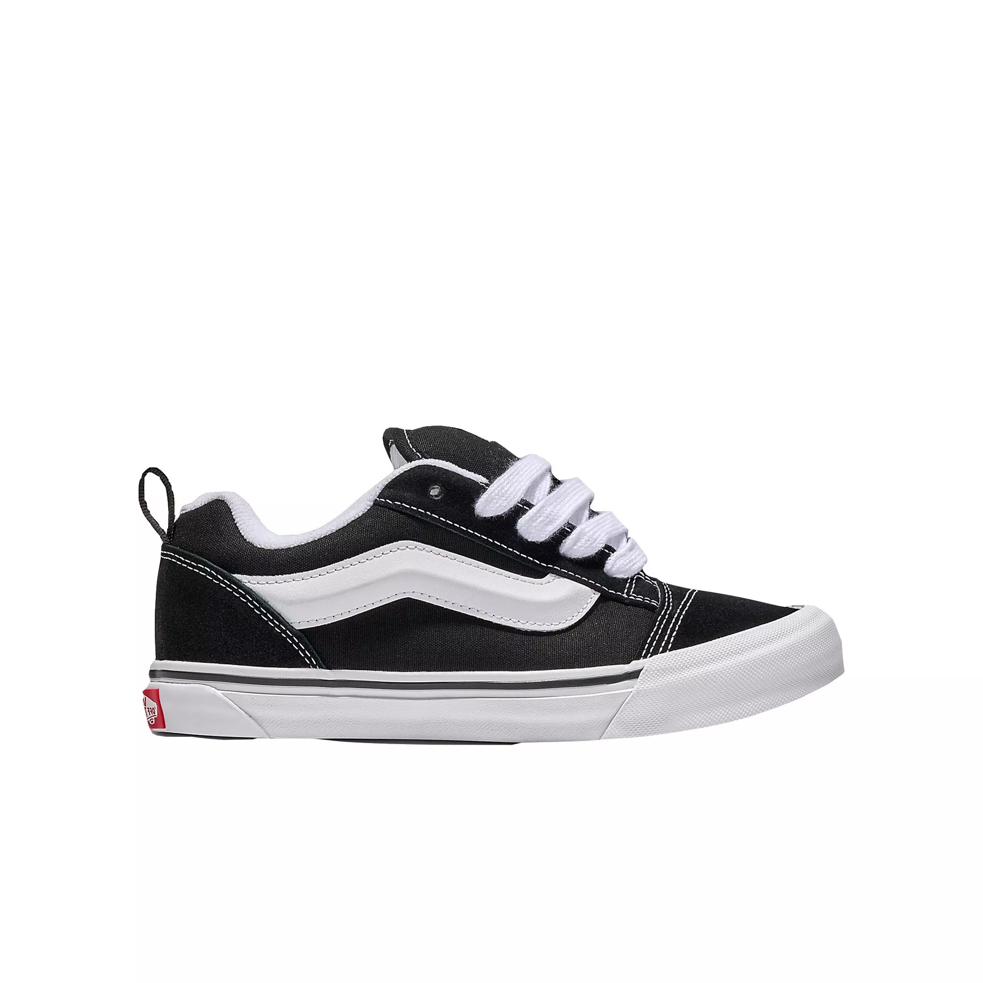 The Vans Knu Skool "Black/True White" Grade School Boys' Shoe offers a modern interpretation of a 90s classic with a puffed tongue, 3D-molded Sidestripe and oversized, chunky laces that make a bold statement.