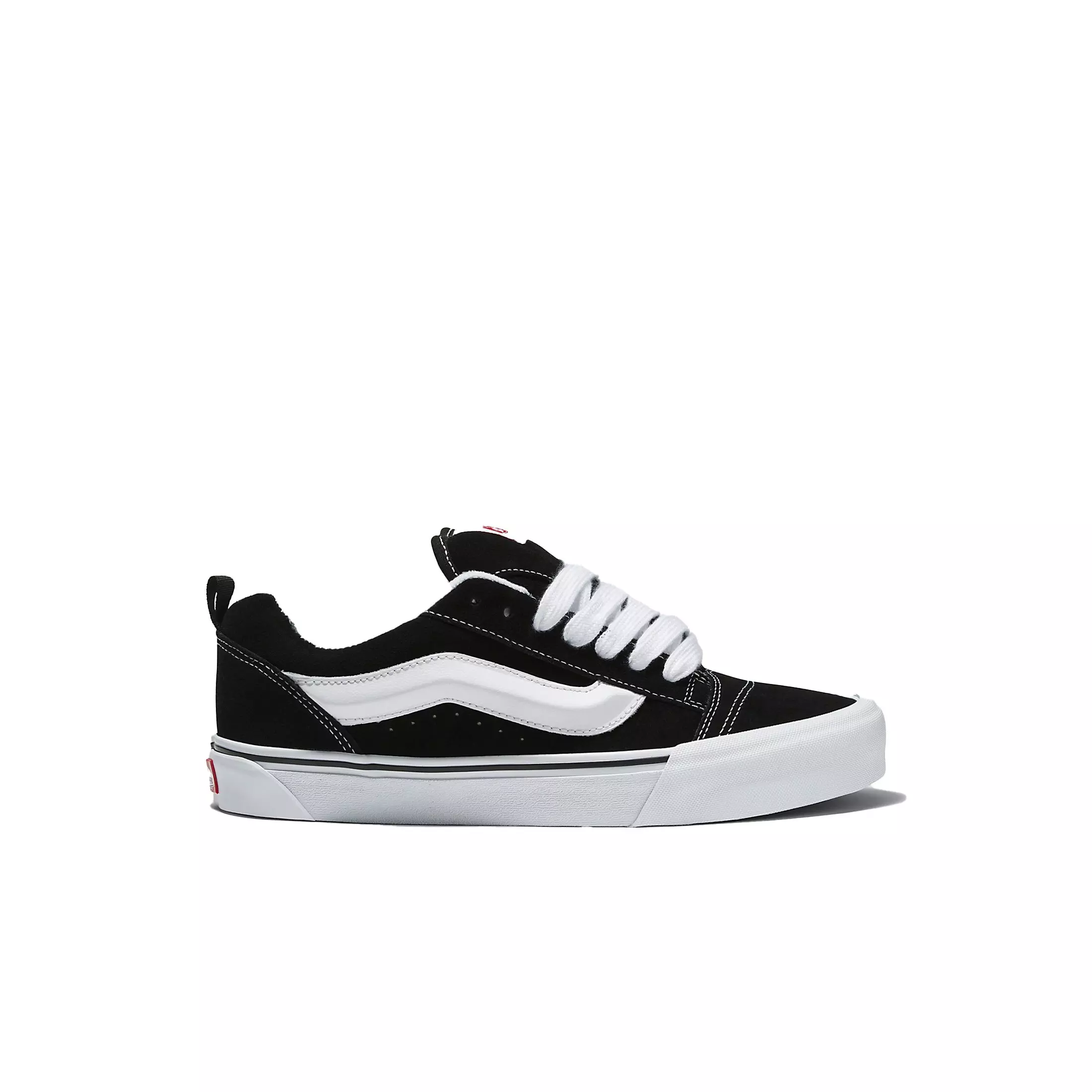 The Vans Knu Skool "Black/White" Toddler Kids' Shoe revives a bold 90s silhouette with a puffed tongue and 3D-molded Sidestripe™. Chunky laces accentuate its oversized shape and add dramatic flair.