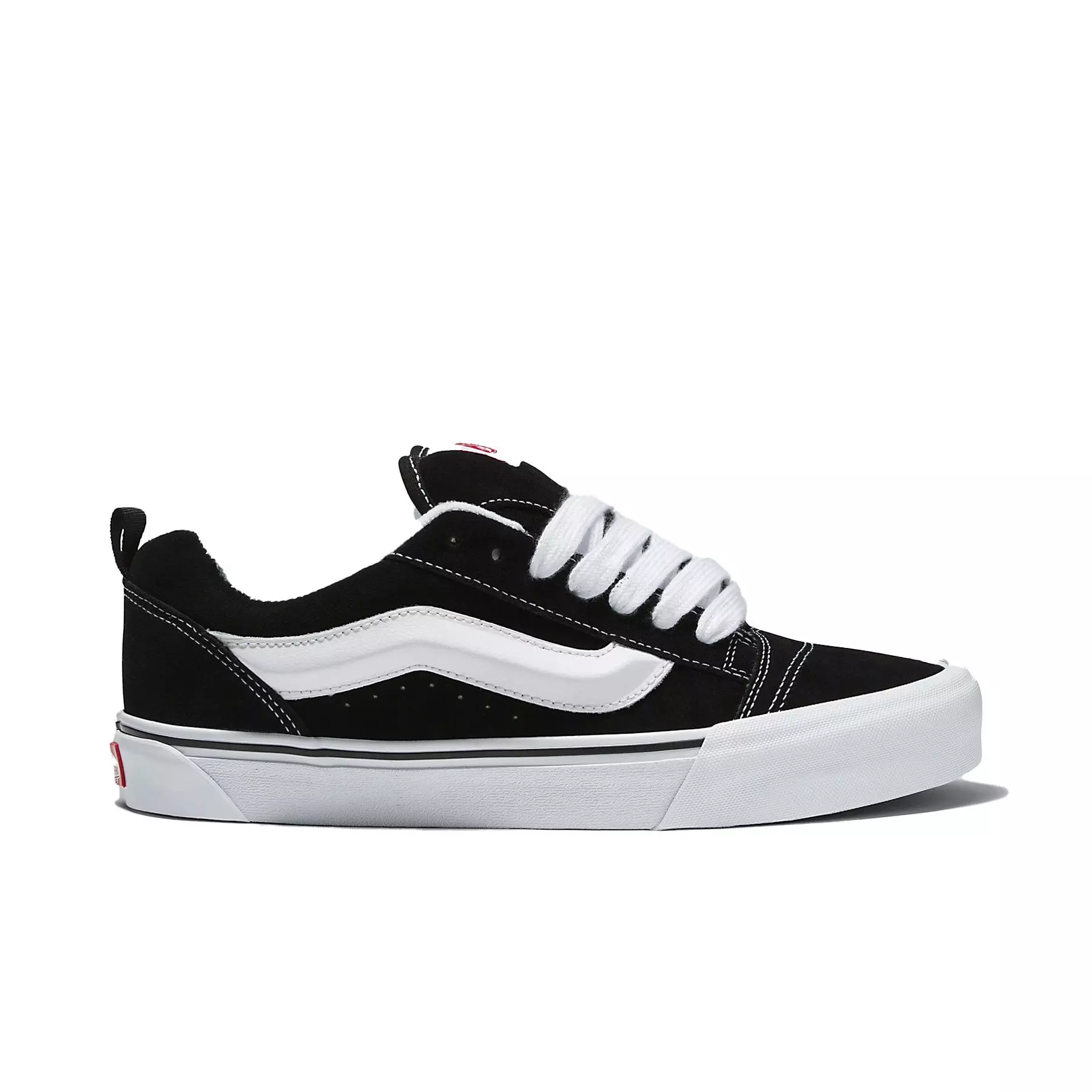 Meet the Vans Knu Skool "Black/White" Unisex Shoe, a modern take on a 90s classic. It features a puffed-up tongue, a 3D-molded Sidestripe™ and oversized chunky laces.