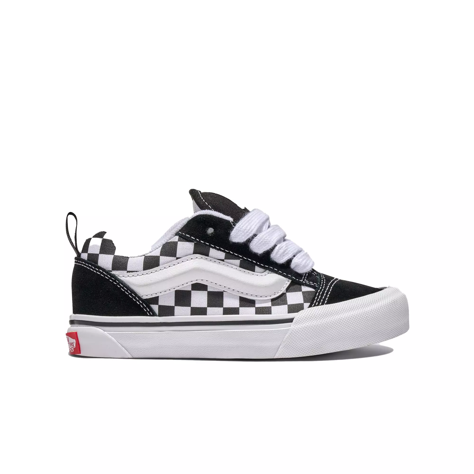 The Vans Knu Skool Checkerboard "Black/White" Grade School Kids' Shoe reinvents a classic 90s silhouette with a sleek puffed-up tongue and 3D-molded Sidestripe™. Oversized chunky laces enhance its in-your-face profile.
