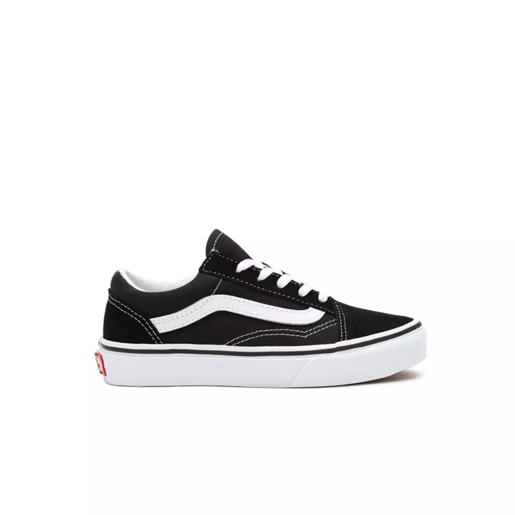 The Vans Old Skool "Black/White" Preschool Kids' Shoe features sturdy canvas and leather uppers, reinforced toecaps that withstand repeated wear and padded collars providing flexible ankle support. This classic silhouette first sported the iconic sidestripe and sets the standard in skate-inspired style.