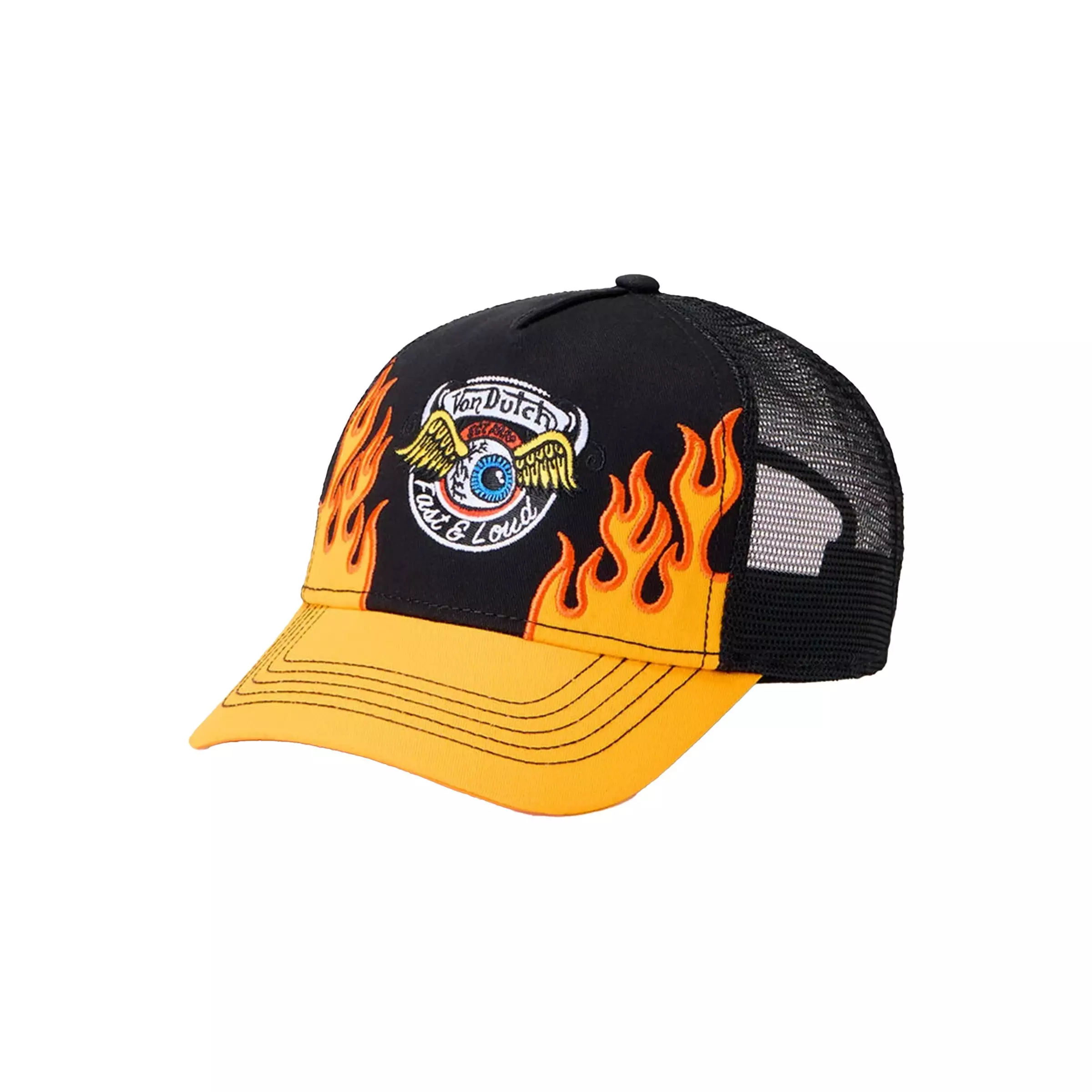 Add a touch of casual cool to your wardrobe with this Von Dutch Heat Flames Trucker Snapback Hat-Black. The breathable mesh back panels and adjustable snapback closure ensure all-day comfort and ventilation, making it perfect for outdoor adventures, road trips, or everyday wear. The front features a unique Heat Flames patch that enhances your personal style, while the structured crown keeps the hat looking sharp and fresh. A classic trucker with modern flair, this hat pairs effortlessly with any laid-back outfit.Features