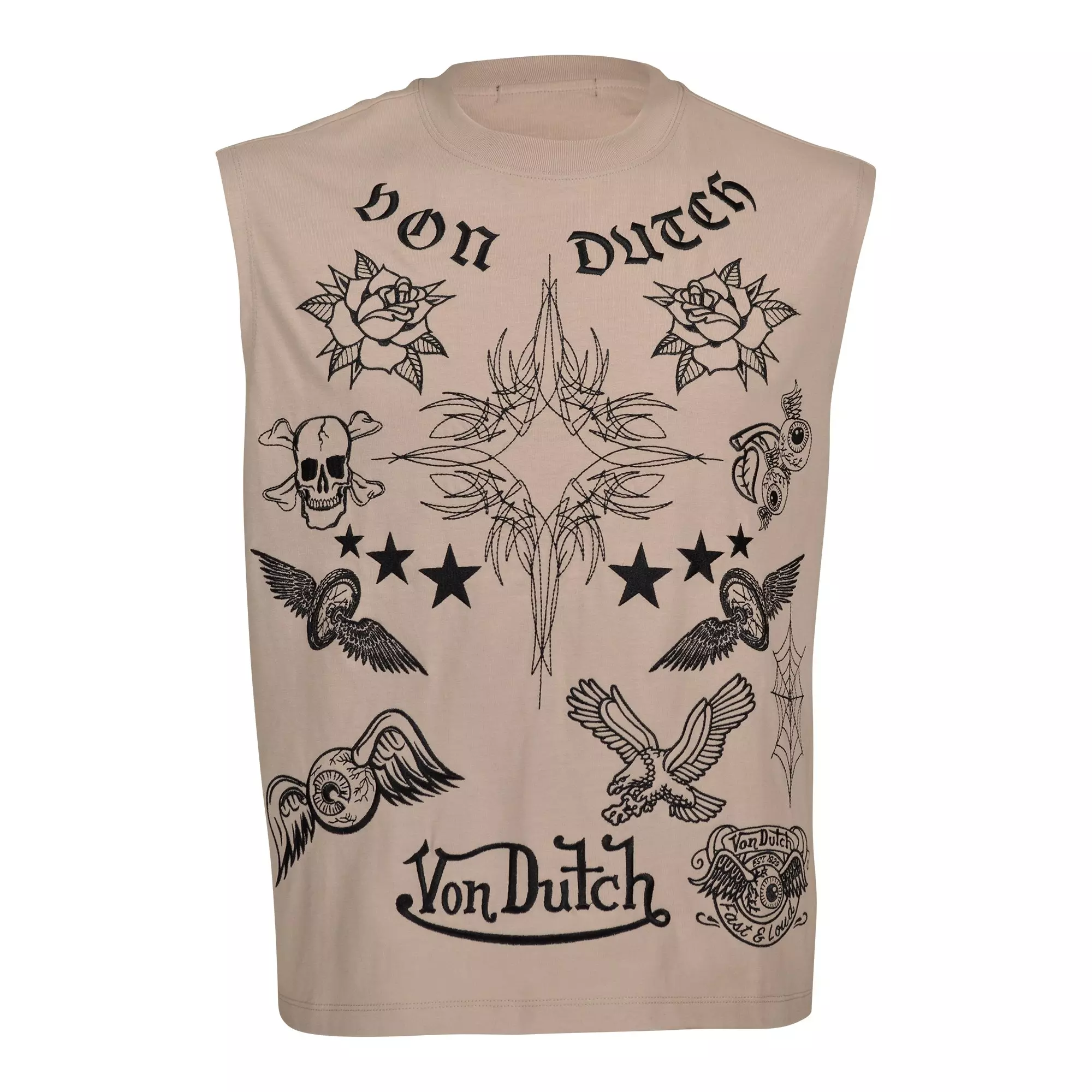 The Von Dutch Men's Embellish Tattoo Ancient Scroll Muscle Shirt features the brand's iconic logo and an edgy street-style design. Crafted from soft, breathable cotton, it ensures all-day comfort with a relaxed fit that moves with you.