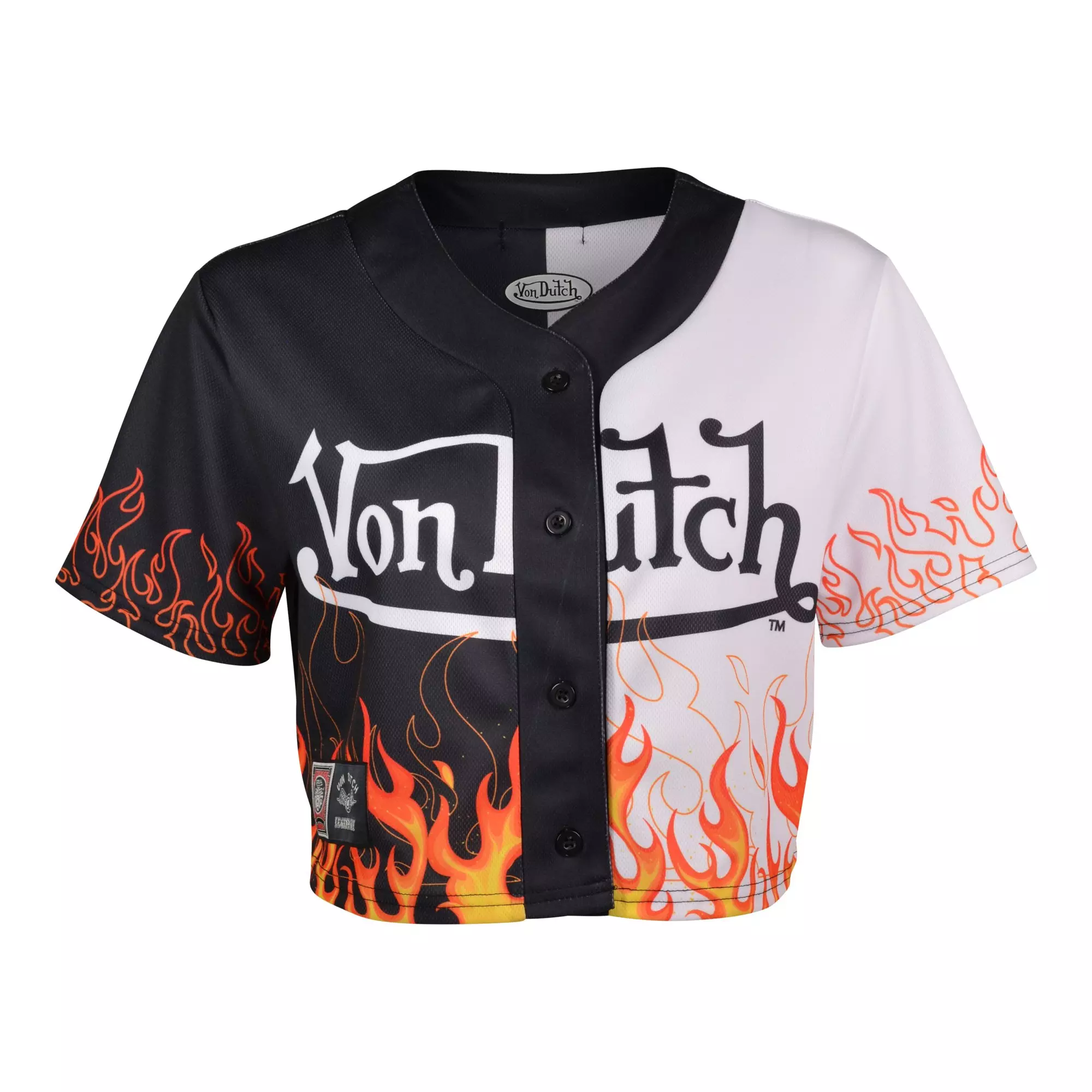 The Von Dutch Women's Split Color Flame Jersey - Black/White brings bold energy to your performance wardrobe. Made from soft jersey fabric, it features a dynamic split black-and-white flame design with sporty graphics and striking font accents that make a strong statement on race days or casual outings.